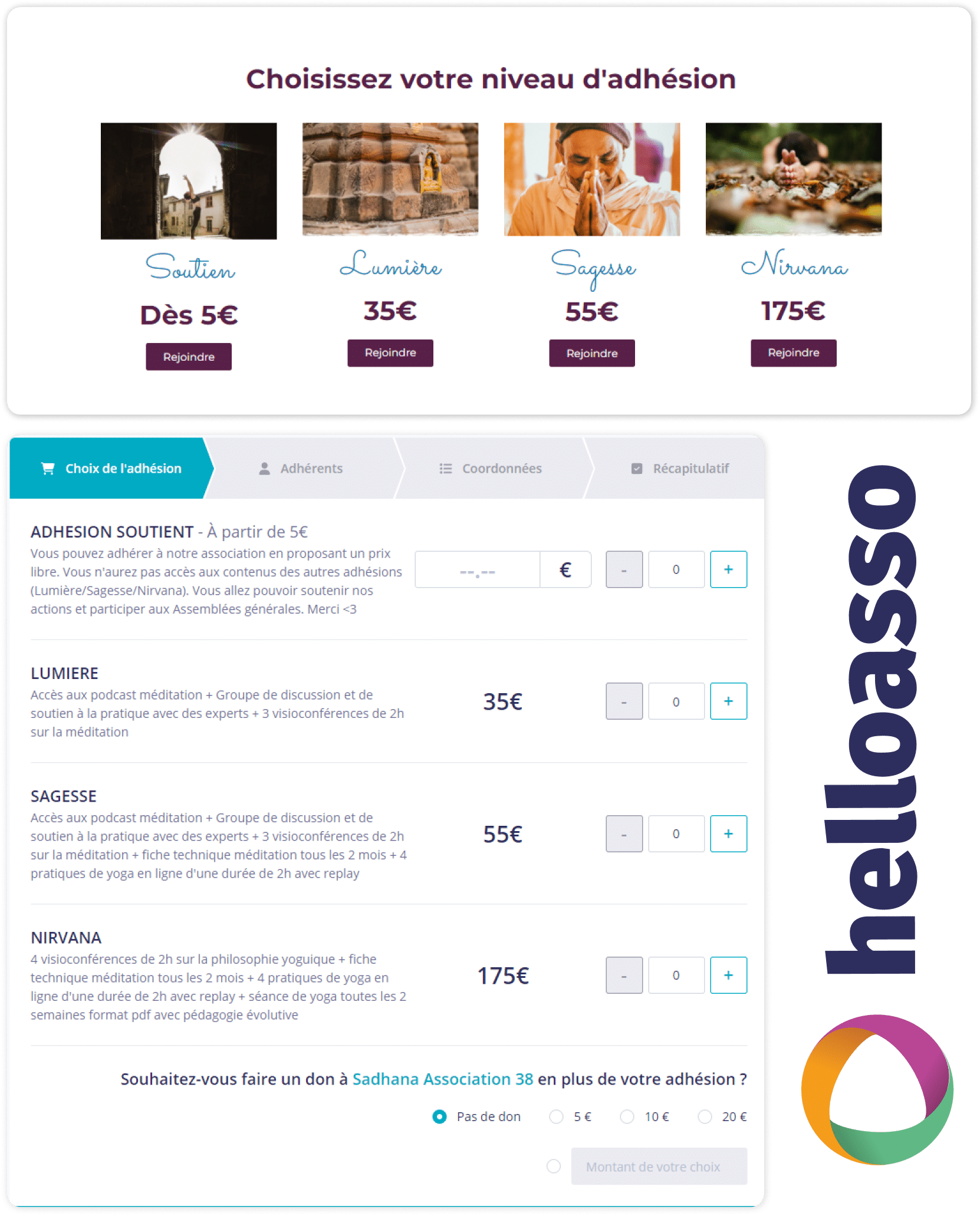 Le site sert de passerelle vers HelloAsso pour gérer les adhésions et le dons.