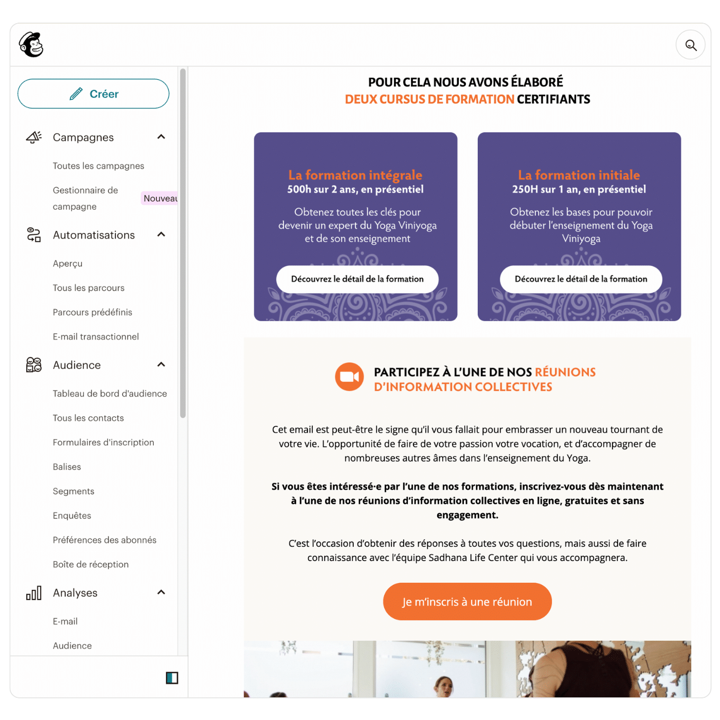 Lola Yoga et Sadhana Life Center possèdent une belle communauté de plus de 8 000 abonnés cumulés. Aussi, nous avons repris en charge la diffusion de newsletters sur MailChimp, dans le but d’informer des différents événements liés aux marques, perpétuer le lien avec la communauté et favoriser l’engagement.